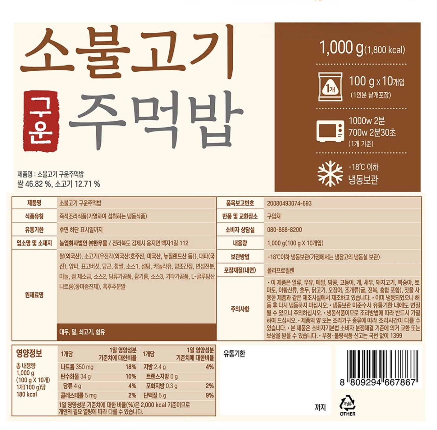 한우물 소불고기 구운주먹밥 10개입 (냉동), 1kg, 1개